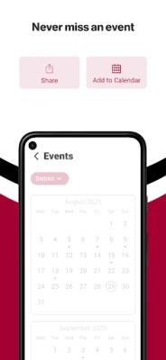 NEVER MISS AN EVENT The event section shows a list of events throughout the district. Users can add an event to their calendar and share the event with friends and family with one tap.